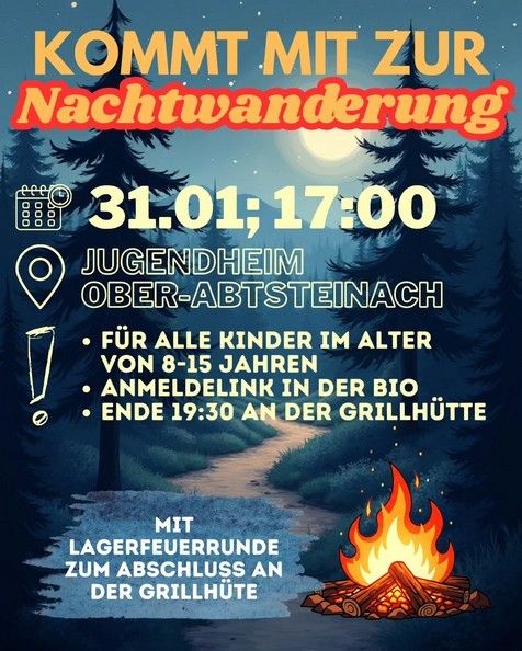 Treffpunkt 17:00 am Jugendheim für eine (hoffentlich) winterliche Nachtwanderung mit anschließender kurzer Lagerfeuerrunde zum Ausklang.